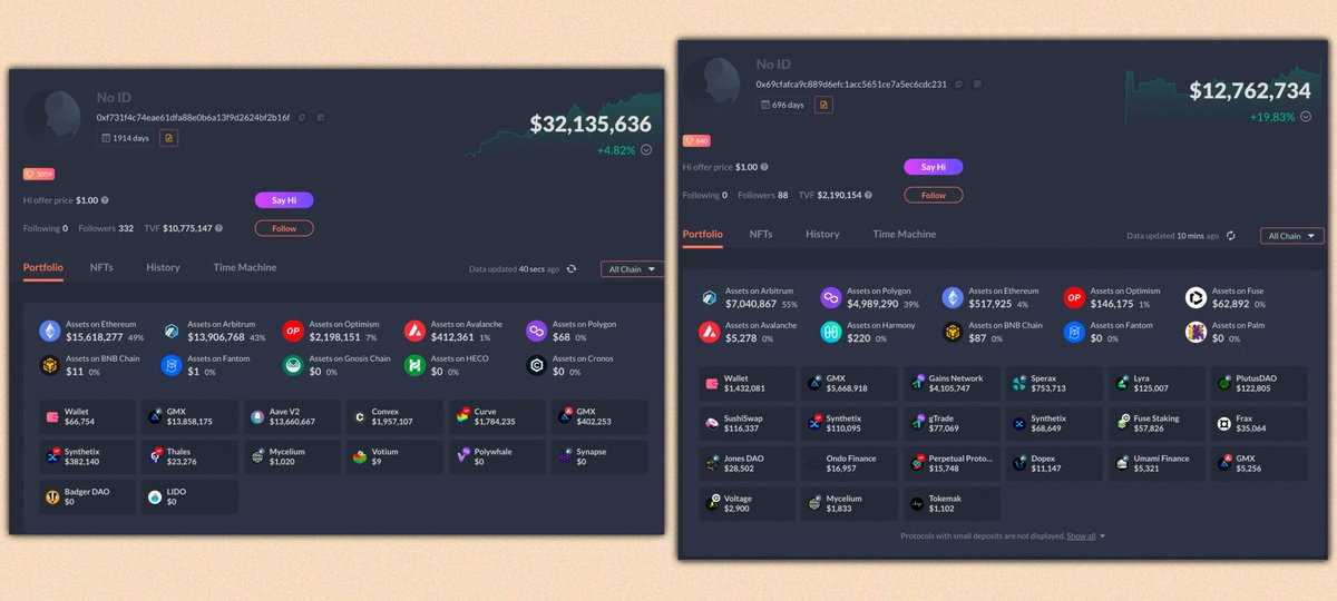 GMX 持有者真实身份很难追踪,由于 Nansen 没显示质押 GMX 得人。Debank 的信息提供了一些协助。