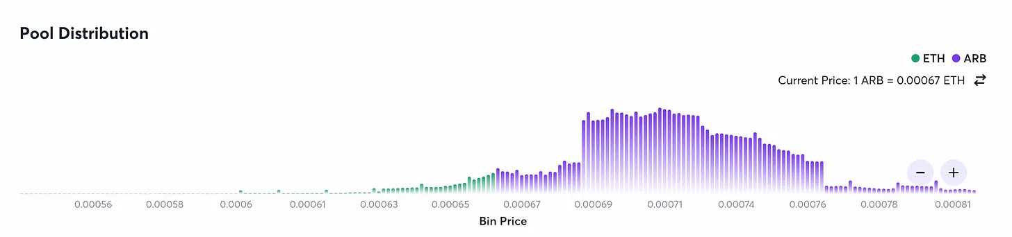 Joe 会合理设置费用来补足这一点,比如 1% bin 宽度的 ARB/USDC 费用为 0.8%,0.2% bin宽度的 ARB/ETH 费用为 0.2%。加上此点并不容易察觉,所以还好笑。