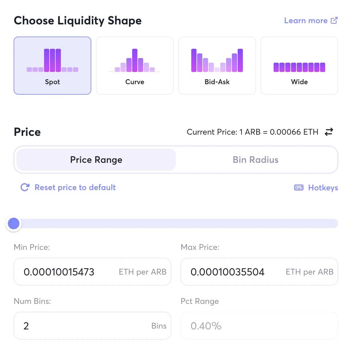 我们再对该池尝试添加流动性,发现是可以添加单点流动性,就是说添加的流动性就在一个价格上,这其实就相当于在订单簿中放一个 Maker 单。那旁边的 Pct Rage = 0.20% 是怎么回事?