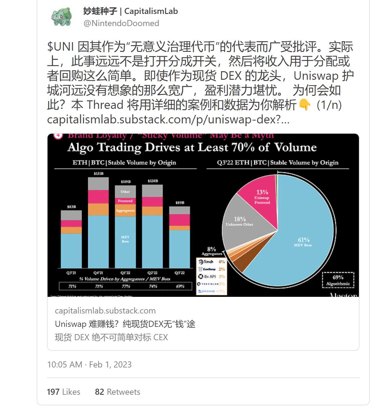 集中流动性高效率+支持激励,有望吸引到 LSD 等有流动性需求的合作方来提供激励,比如此前 UNI V3+ 激励 模式 Kyberswap, 就从 Lido 拿到了仅次于 Curve 的激励分配(参见下方推文) ,并且占据了极大的 Alt-l1/L2 的 LSD 交易量份额。