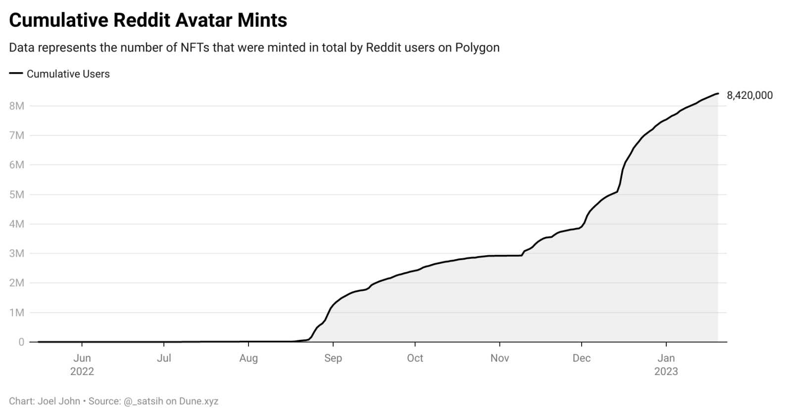 你看到这里的趋势了吗?大型平台可以驱动用户行为,所以允许用户在 Twitter 上验证他们的 NFT 或将 NFT 链接到他们的 Instagram 个人资料是一件大事。(我们稍后会回到这个话题。)为了感受 Web2 平台的规模,回想一下 Reddit 的 NFT 在 Polygon 网络上已被 mint 了超七百万次。Web3 产品必须走近用户所在的地方。