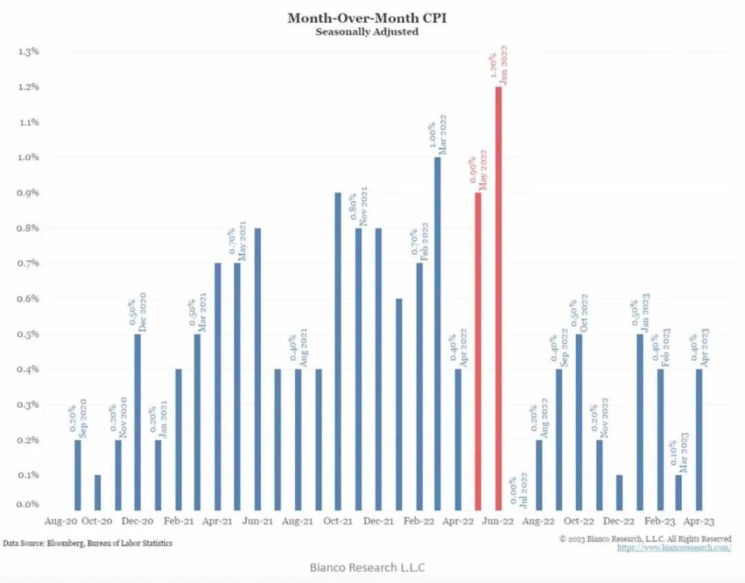 我具体指的是美国消费者物价指数(CPI)。由于被称为基数效应的统计现象,2022 年的高月环比(MoM)通胀数据将被夏季 2023 年较低的月环比通胀数据所取代。如果 2022 年 6 月 CPI 环比通胀率为 1%,而 2023 年 6 月 CPI 环比通胀率为 0.4%,那么年同比 CPI 将下降。