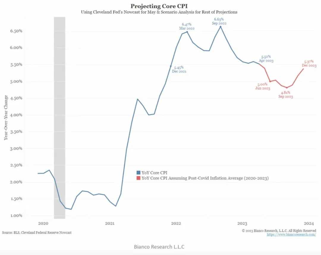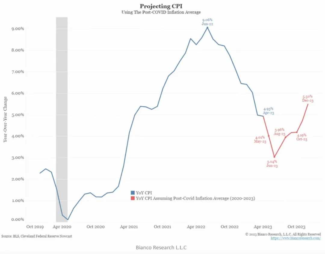 如上图所示,去年的一些最高月同比消费者物价指数(MoM CPI)数据(这些数据在当前年同比数据中有所考虑)出现在五月和六月。对于 2023 年,月同比 CPI 的平均值为 0.4%,这意味着如果我们只取平均值,并将 2022 年 5 月至 12 月的所有数据替换为 0.4%,我们将得到以下图表:
