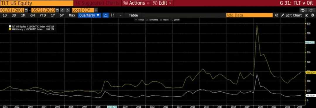 TLT ETF(20年以上美国国债)除以 WTI 原油现货价格(白色线)