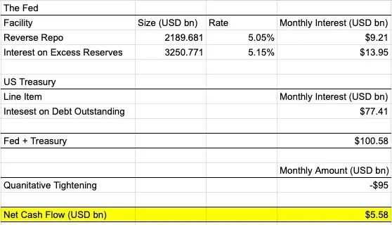 综合考虑,美联储通过 RRP 和 IORB 支付的利息以及美国财政部债务支付的利息具有刺激作用。但是美联储不是应该通过量化紧缩(QT)计划减少货币和信贷的数量吗?是的,这是正确的,但是现在,让我们分析一下净效应及其将来如何发展。