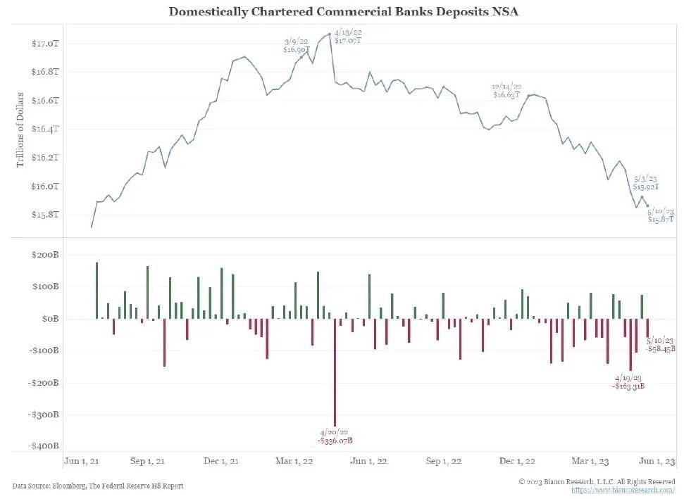 1. 私营部门继续更倾向于通过货币市场基金和 RRP 向美联储借贷,而不是将资金存入银行。由于存款基础下降,美国银行继续破产并获得救助。美联储的资产负债表可能没有贮存这些烂账,但是联邦存款保险公司(FDIC)现在已经满是烂账贷款。从根本上讲,这仍然是通胀的,因为存款人将以印制货币的形式全额偿还,他们能够通过向政府借贷而不是向银行借贷来获得越来越多的利息收入。