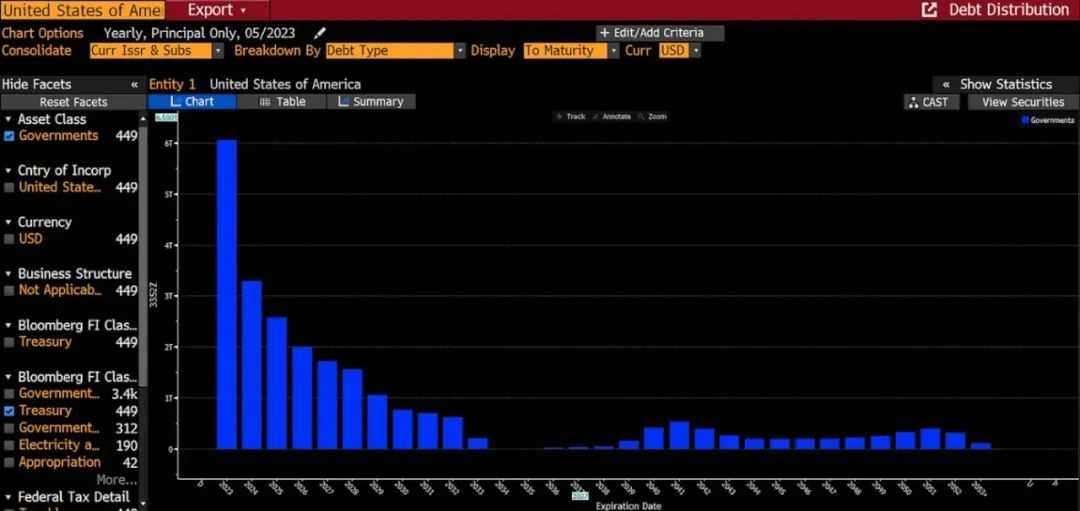 3. 美国财政部将很快需要在可预见的未来为 1~2 万亿美元的赤字提供融资,并且必须以较高且不断上升的短期利率进行融资。考虑到美国债务总额的到期情况,我们知道实际货币利息支出在数学上只能上升。