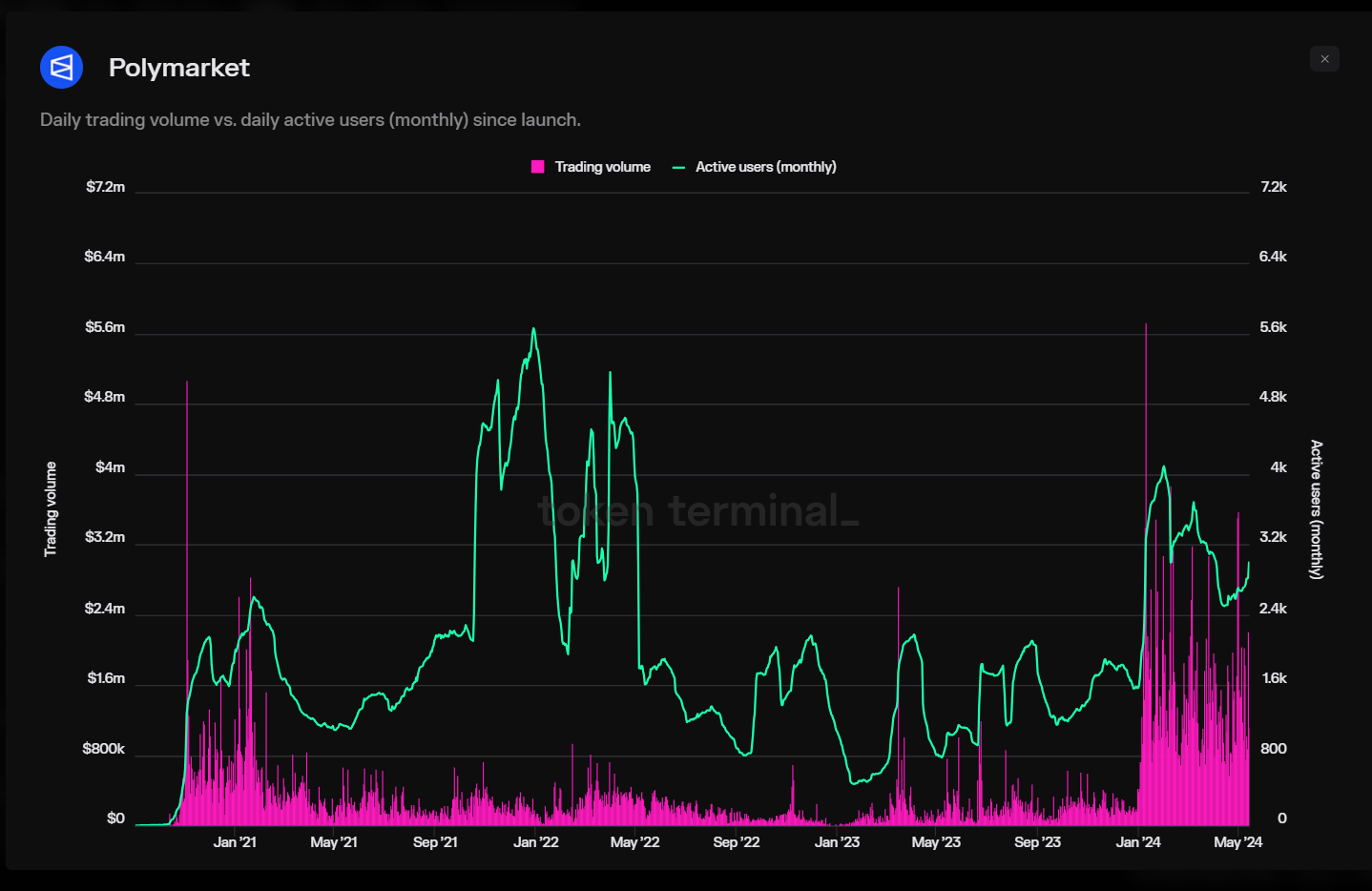 根据 Token Terminal 的数据,Polymarket 今年以来的最高交易量出现在 1 月 10 日,为 573 万美元。这个平台在 1 月经历了月活人数的显著增长,从 1 月 1 日的 1600 人上升到 2 月 1 日的 4100 人,4 月后的月活数有所放缓。截至 5 月 15 日,Polymarket 上的预测金额已达 2.027 亿美元。
