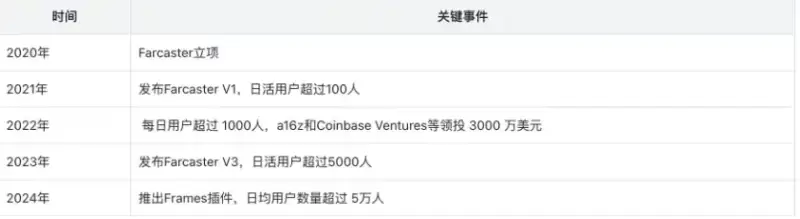 2020 年 Farcaster 立项,由创始人 Dan Romero 和联合创始人 Varun Srinivasan 创立。项目发展的关键事件如表 1 – 3 – 1 所示: