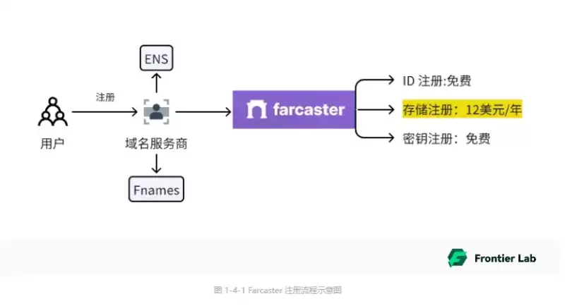 用户注册:首次使用需要用通过 ENS 或者 Fnames 注册一个自己的域名,然后将其在 Farcaster 上进行 ID 注册、存储注册和密钥注册,如图 1 – 1 – 4 所示。