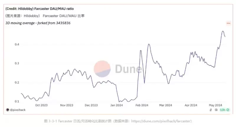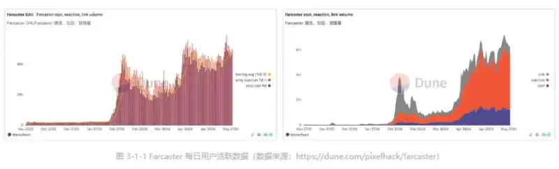 由图 3 – 1 可以看出,Farcaster 的 DAU 持续增长,并维持在 40000 上方,并且从右图中看出三种消息交互方式:casts、reactions 和 links 中,reactions 是使用最多的选项,即用户之间对发表的帖子进行点赞的行为是最多的互动类型,这体现出在 Farcaster 的日活用户中占比最大的是存量客户。