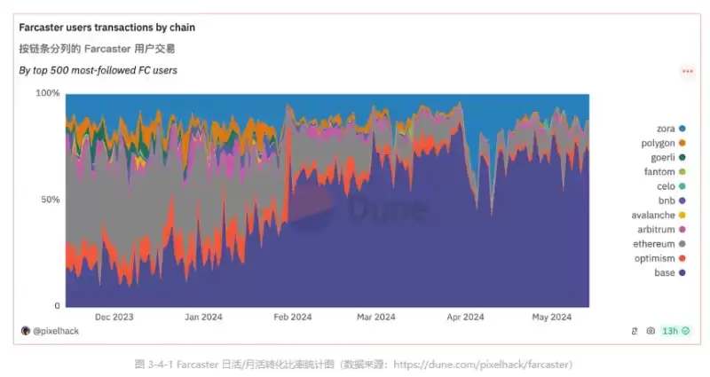 图 3 – 4 – 1 中数据显示,Farcaster 用户交易占比最大的链是 Base 链,从侧面证明,现在用户们选择 Farcaster 的最主要的原因还是因为 meme,所以 Farcaster 搭建了 meme 信息传播的渠道以及用户可以直接在 Farcaster 项目内通过 Frames 参与 meme 项目的空投、积分,有助于 Farcaster 数据的增长。