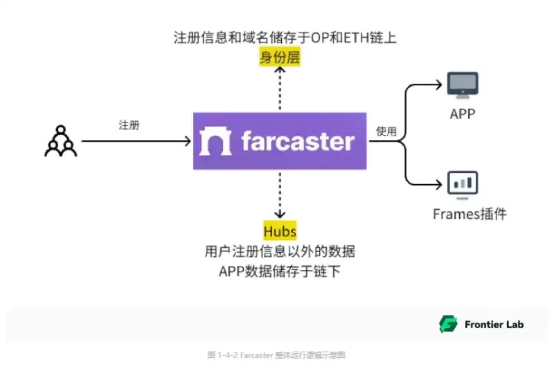 综上所述,Farcaster 首先通过将项目自身的存储从原先 SocialFi 项目所采用的链上存储转化为了链上+链下的混合存储方式,不仅使得 Farcaster 的存储成本大幅度降低,并且提高项目的运行速度。其次 Farcaster 采用了 Frames 插件,使得 Farcaster 的用户数量出现爆发式增长,Farcaster 整体运行逻辑如图 1 – 4 – 2 所示。