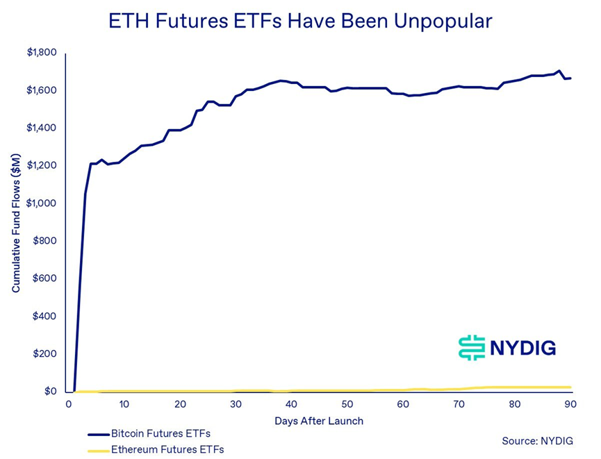 如果 ETH ETF 在比例上与 BTC ETF 一样受欢迎,人们可以预计将有 45 亿美元流入该综合体,然而,ETH 期货 ETF 的不受欢迎提供了一个警示故事。