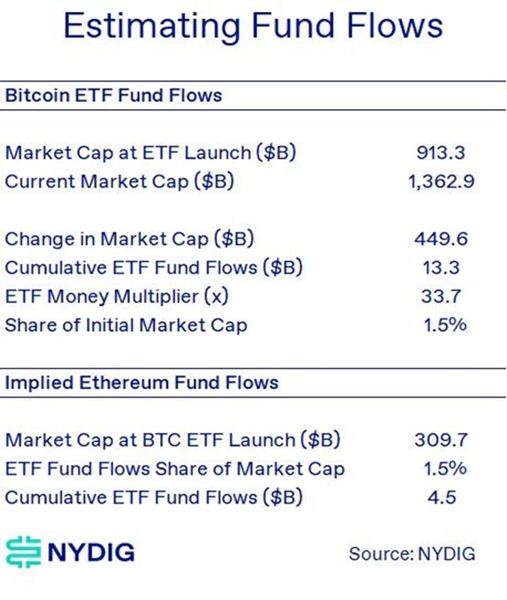 有鉴于此,以比特币现货 ETF 的推出为指导,我们可以对 ETH ETF 的潜在需求做出一些假设。使用类似的资金流量份额作为初始市值的百分比,我们估计 ETH ETF 的流入量为 45 亿美元,约为比特币 ETF 流入量的三分之一 ( 也是类似的市值比例 )。