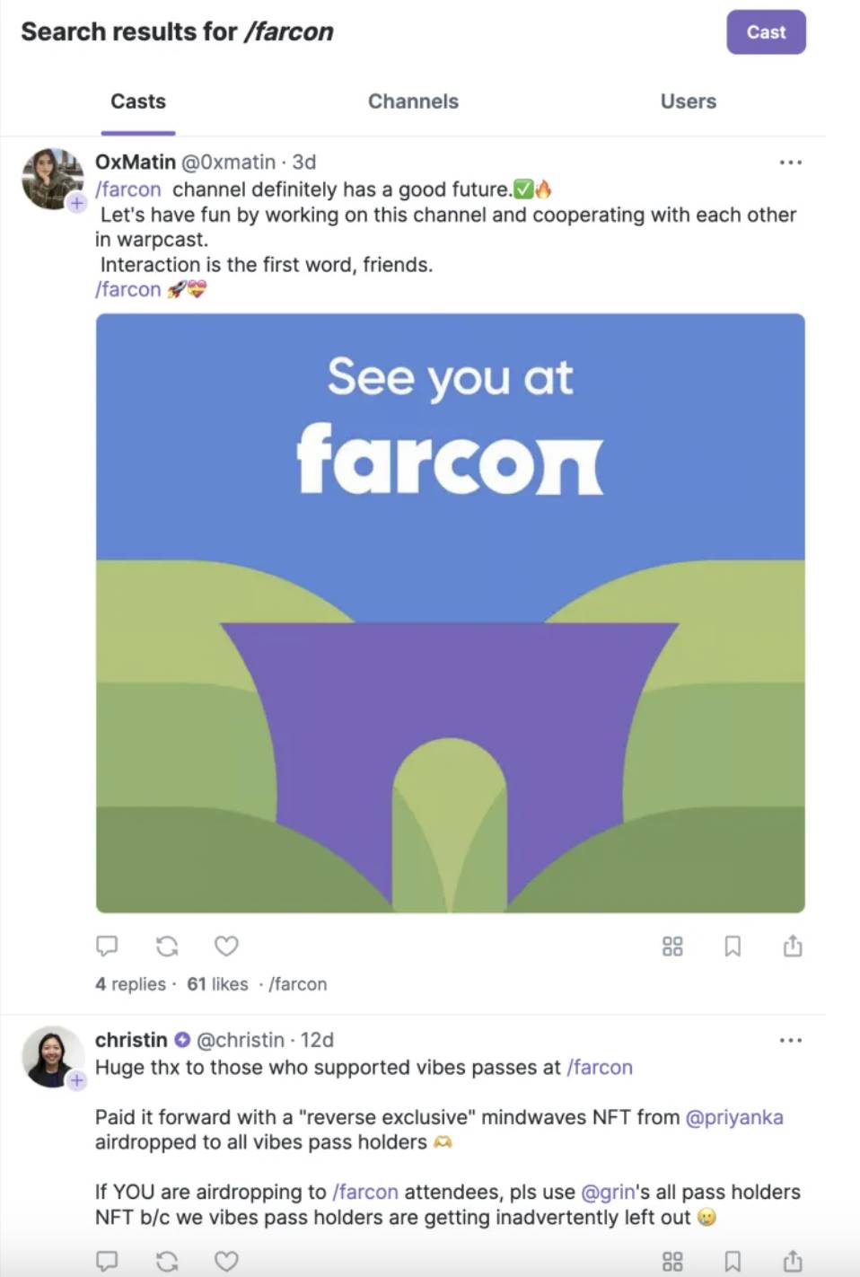 在 Farcaster 中,Casts(类似于发推)可以链接到任何 URL,而不仅仅是其他广播cast。这使得可以基于同一个 URL 创建新的动态。例如,Degen 频道中的所有广播casts都链接到与 Degen 代币合约对应的 URL。