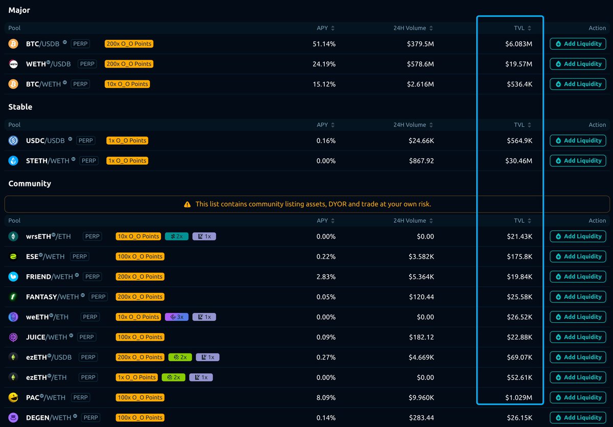 我们可以看到主流资产的流动性相对充沛,但社区板块的山寨币 TVL 比较有限,同时目前相关的项目也在使用积分激励流动池。