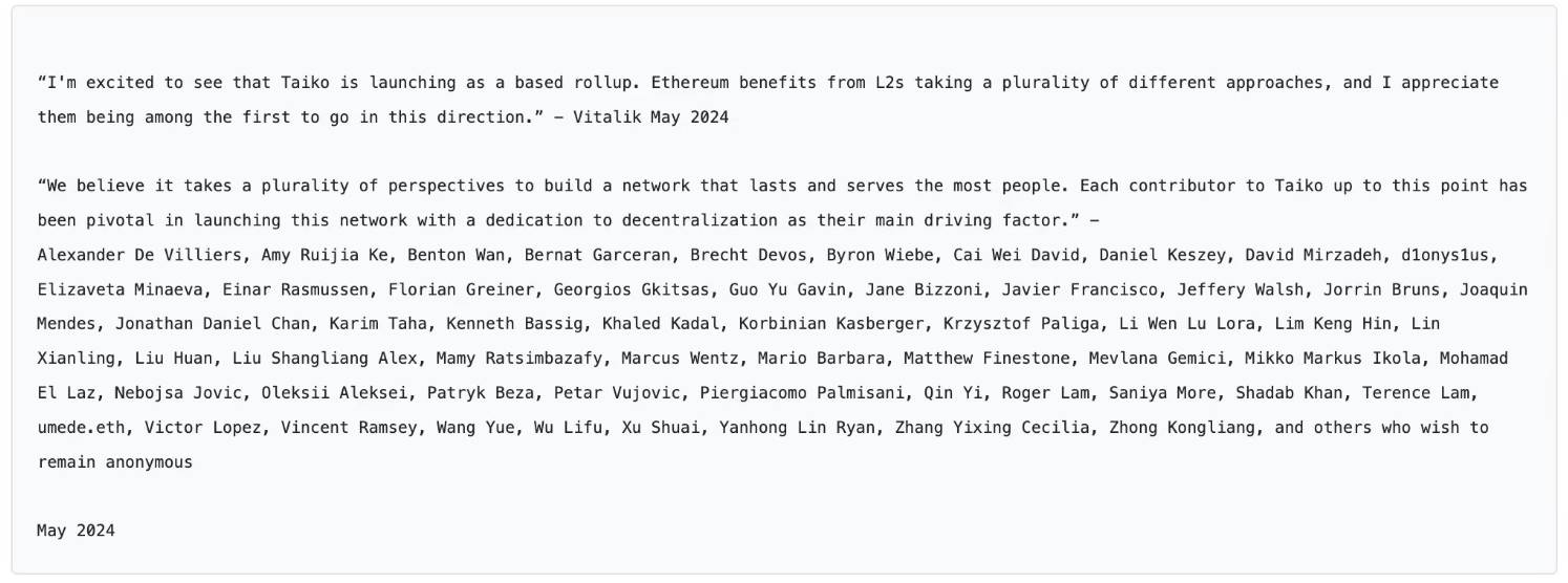 突出的技术实力和创新能力不仅使得 Taiko 成为许多人眼中的以太坊 L2 赛道创新排头兵,也让社区对于 Taiko 主网上线空投抱有极高期待:2024 年 5 月27 日,Taiko 主网正式上线。而值此项目里程碑时刻,Vitalik 一如既往的送上了支持与祝福,在网络上打包了高度为「1」的头块,其元数据包含每个 Taiko 核心贡献者的姓名,并表达了对 Taiko 主网上线的期待以及感谢了团队在实现去中心化社区主导、推动网络启动所做出的关键性支持。