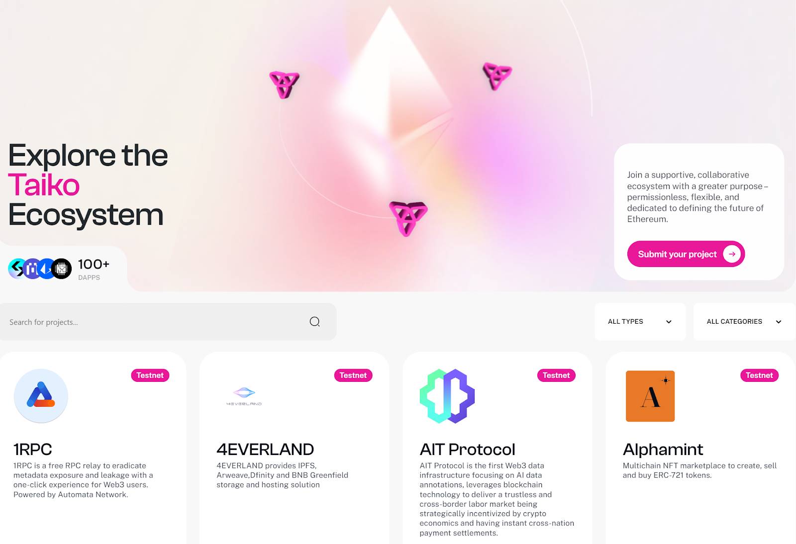 根据 Taiko 官方网站的数据显示,目前已有 100+ 项目已入驻 Taiko 生态,类别囊括钱包、NFT 市场、预言机、 DeFi、AI 应用程序等。