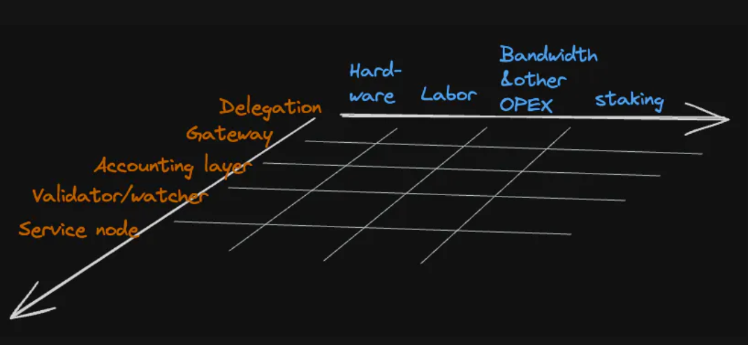 专有 L1:网络运行其自己的区块链。例如 Arweave、Filecoin 和 POKT Network。通常,服务和验证节点也涵盖这一角色,因此相关成本也包含在内(然而,如果可能,我们尝试将其分离——参见示例中的 POKT Network)。