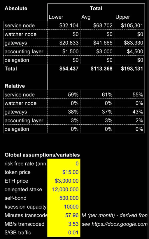 如果假设类似的价格水平(1 ETH 为 3,000 美元),这应该足以使网络达到收支平衡区域。然而,如果转码价格下降 50%,网络级费用收入约为每月 45,000 美元,低于成本估算的低端。随着新的用例如 AI 视频生成的出现(因此增加了货币化机会),尚需观察 Livepeer 网络上的成本和收入动态将如何变化。