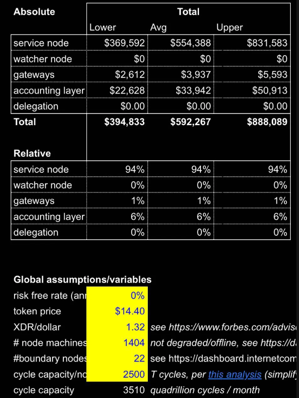 ICP是为数不多的网络之一,其中基于法定的成本被纳入代币奖励机制,这使得成本评估更容易。目前约有 1,400 台节点机器由大约 85 名运营商运行。我们没有关于大型运营商规模经济的数据点,因此我们的整体估算范围相当广泛:每月约 40 万至 90 万美元,平均约 60 万美元。