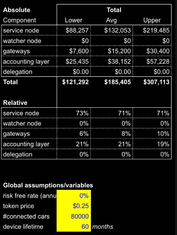 我们没有关于网络实际收入的指示,但根据全球汽车数据市场和相关收入的估算,当前每辆车的数据收入约为 150-185 美元,到 2030 年将增长到 500-600 美元⁵。如果 DIMO 能够将其中的 10-15% 货币化,结果收入范围为每月 110,000-180,000 美元,从而覆盖运营成本。