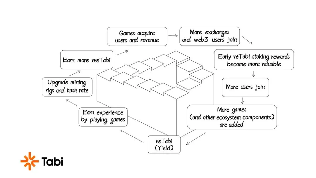 为了获取更多的veTabi(收益)——玩游戏获得经验——矿机提升等级与算力——得到更多的veTabi——游戏获取用户和收入——交易所以及更多web3用户加入——veTabi前期的投票奖励资产变得更加值钱——更多用户加入——有更多的游戏(以及其他生态)以此形成绝对的优势,这种飞轮效应增强了 Tabi 对游戏发行的影响力。