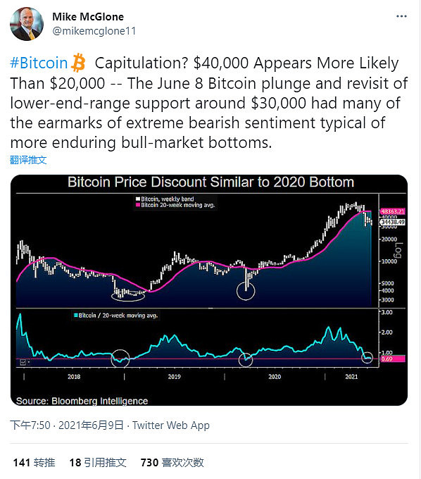彭博首席大宗商品策略师Mike McGlone今日在推特上表示,比特币更有可能突破4万美元,而不是跌至2万美元。