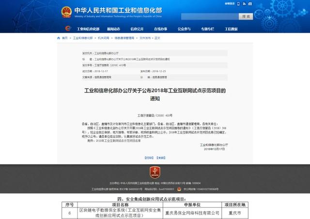 并凭借在工业互联网的落地应用成功案例,获得了2018年国家工信部工业互联网试点示范项目(全国入选72个项目,易保全唯一区块链入选项目)、2019年重庆市工业互联网(工业智能化)试点示范项目、2020年重庆市第一批工业互联网试点示范项目。