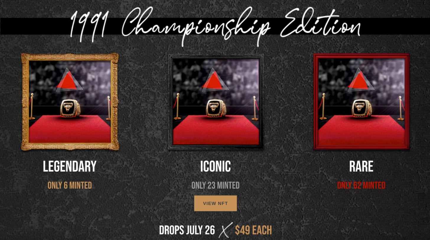 在友谊日的同一周,也就是 7 月 26 日,Shopify宣布商家可通过其Shopify店面销售 NFT ,而第一个吃螃蟹的是芝加哥公牛队。那一天,公牛队推出了 nft.bulls.com ,并一次性推出了6枚冠军戒指 NFT。