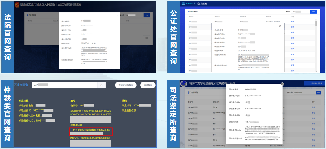 用户在微版权进行确权和取证的数据,都会实时同步至公证处、司法鉴定所、法院、仲裁委、版权保护中心等节点上,并可在其官网实时查询数据的相关信息,实现数据的全过程留痕,全节点可见,全链路可信举证。