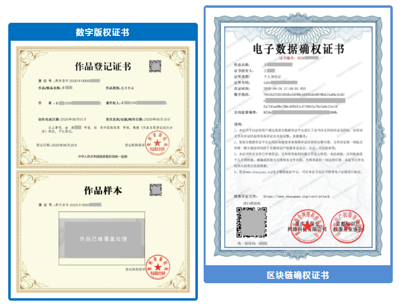 同时,还可在线出具版权证书,包括纸质版权证书和数字版权证书,全国范围内通用,最快1天即可出证,让用户同时获得版权登记证书和区块链作品确权双重证书。有效提高作品登记效率,实现快登快查。