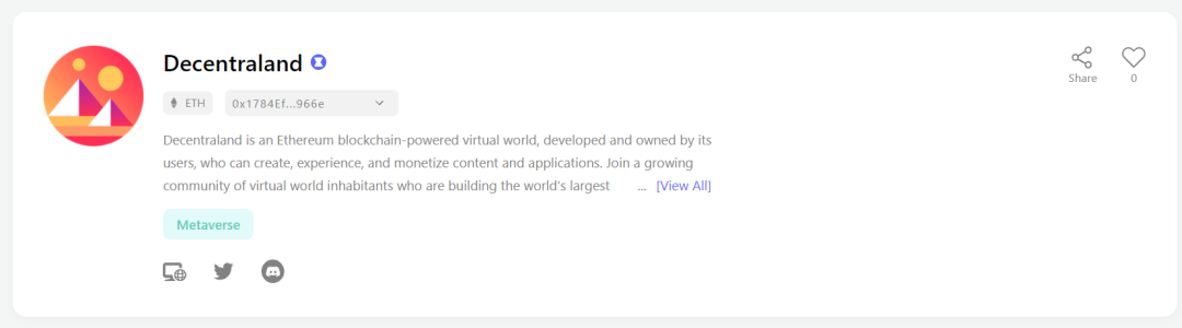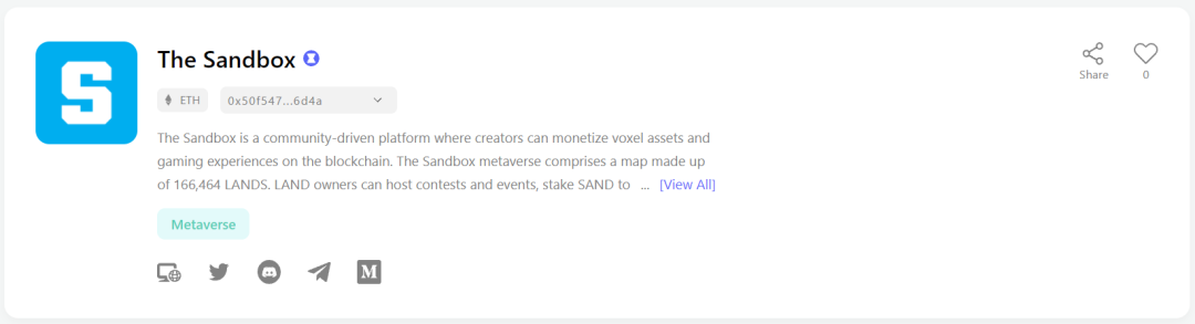 Decentraland 是基于以太坊区块链的沙盒类游戏,一些关注灰度持仓的小伙伴都知道灰度一直都有配置其token-MANA,而且近期在市场不景气的时候仍然在不断的加仓。区别于一般的元宇宙游戏,Decentraland是想做虚拟现实的游戏,想做一个VR世界。比如针对有一些没有实际应用,只能用来收藏和展示的NFT,在游戏场景中可以帮助这些NFT做展示,在这方面Decentraland和非常火爆的Axie Infinity以及加密猫等都是有合作的。在Decentraland里面可以买各种装备道具,土地甚至是名字,也会给玩家提供创建工具,但是在建游戏场景或者游戏机制的时候,是需要编程操作的,所以在这一点上是不如Sandbox的创建工具的no-code形式更能促进普通玩家的创造力。