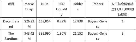 NFT的流动性对投资者来讲是一个非常重要的指标,可以根据这个指标衡量 NFT 以一个合理价格顺利变现的能力。尤其是对于那些不打算长期持有 NFT,并想要通过 NFT 买卖获得收益的朋友,流动性指标确实是必须要关注的数据之一。我们可以看到,30天内The Sandbox比Decentraland的流动性高出5倍多,这意味着对于投机者而言The Sandbox的NFT更不容易出现“有价无市”的情况,降低了风险。