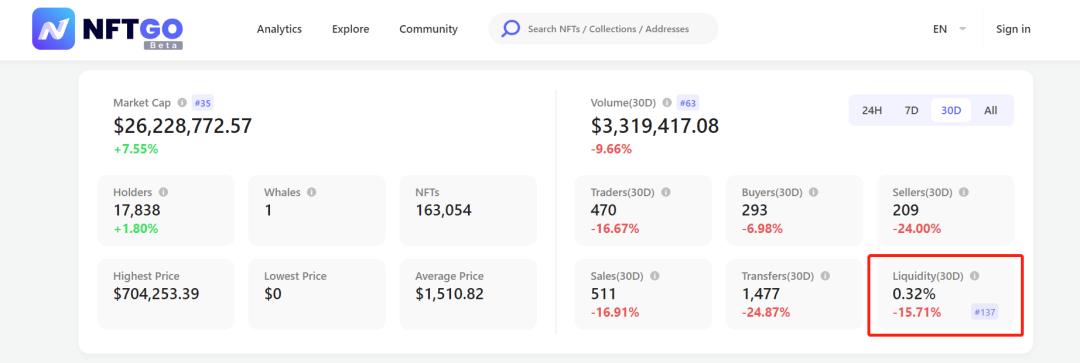 下图为截取nftgo.io平台中The Sandbox和Decentraland的数据详情页,包括市值、交易额、交易量、持有者人数以及流动性等等,这些指标可以作为影响因子,帮助我们更加全面的从细分维度来了解NFT项目,从而更好的做出投资决策。