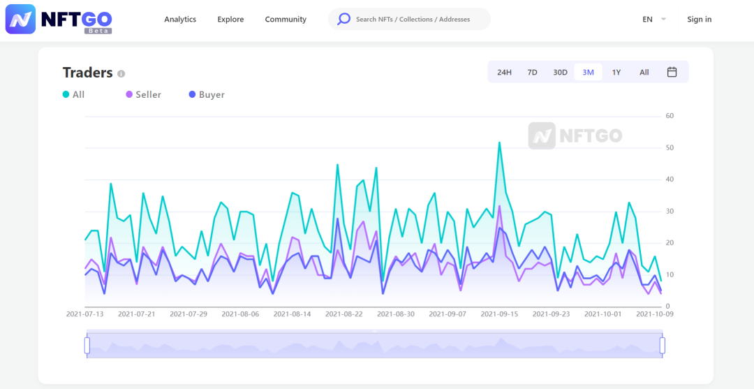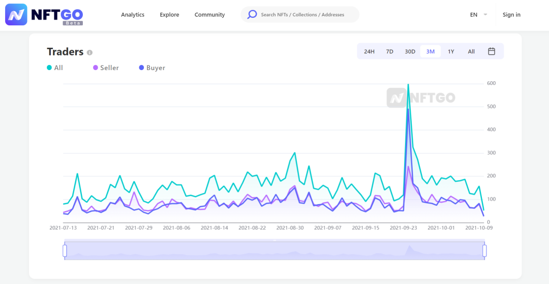 通过Traders走势图(买卖方交易人数走势图),可以直观的看到交易人数走势以及买卖双方市场比例,可以由此判断项目或者说NFT的潜力与热度,透过这些宏观数据判断市场供需情况。
