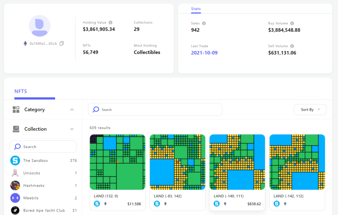如下图,可以进一步查看巨鲸的详细信息,从而进行分析决策,可以看到The Sandbox排名第一的巨鲸343DcA是一个NFT资深玩家,除376个Sandbox NFT外,还持有Mutant Ape Yacht Club、Meebits、Bored Ape Yacht Club、Loot、Art Blocks等23个项目的NFT,持仓总价值达到$3.8M。最近的一次交易是在2021年10月19日,以1050 SAND价格购入了一块Sandbox土地。