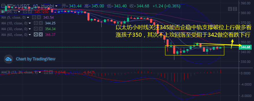 四小时线以太坊在韩币钰老师写行情的时候以太坊调整运行在五日均线上于344上方运行,四小时K线运行在布林带中轨下方,布林带张口下跌,日内以太坊关注四小时线能否企稳345支撑反弹上攻,小时线来看K线调整运行受阻于中轨345阻力压制承压下行风险,不上攻破位的话以太坊韩币钰老师个人还是建议高空为主。