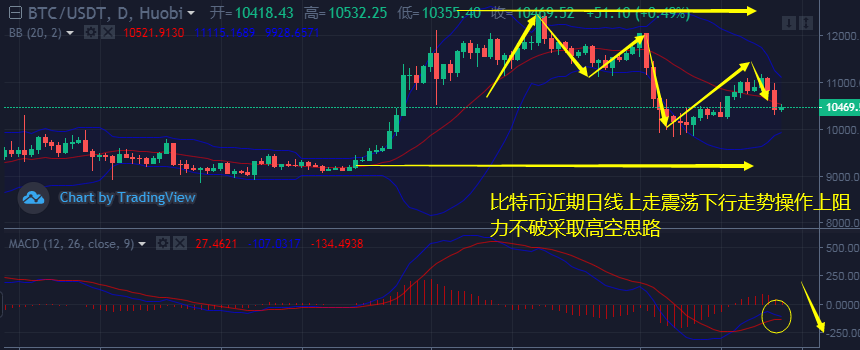 比特币日线上分析上个星期行情小幅震荡盘整于11000一线,日线上短期上方承压于11200中轨上60日均线阻力压制承压下行,本周周一开盘比特币给多头一个下马威暴跌下行,日线上周一收取一根阴线,K线跌至中轨下方运行,布林带张口下行风险,日线上既然盘整许久不上那就必跌走势,最低昨天刷新低点于10293.88,触及10300一线获得支撑反弹上行,日线上短期日内调整上行依旧上方承压长久一个压力位10500中轨受阻回落下行,日线上日内操作上韩币钰老师个人建议反弹中轨10500阻力区布局空单买入。