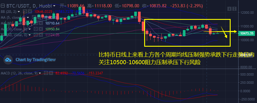 比特币日线上昨天受到日线上10500阻力压制承压下跌,日线本周周一跌至下方中轨下方的时候后下方获得10200支撑,日线上昨天一天维持区间10200-10500震荡整理,比特币昨日收取一根带有上下影线的小阳K,上下波动幅度不大,行情并没有像大多数人所预想的那样猛烈。日图布林带收口,行情位于中轨下方沿中轨运行,MA5日均线下穿10日均线低头往下运行。附图MACD在零轴下方死叉运行,绿色动能柱,指标弱势加强。日线上调整上方还是得关注10500关口得失,日线上不上破至10500上去的话,日线级别韩币钰老师个人对于后市走势还是看好震荡下行走。