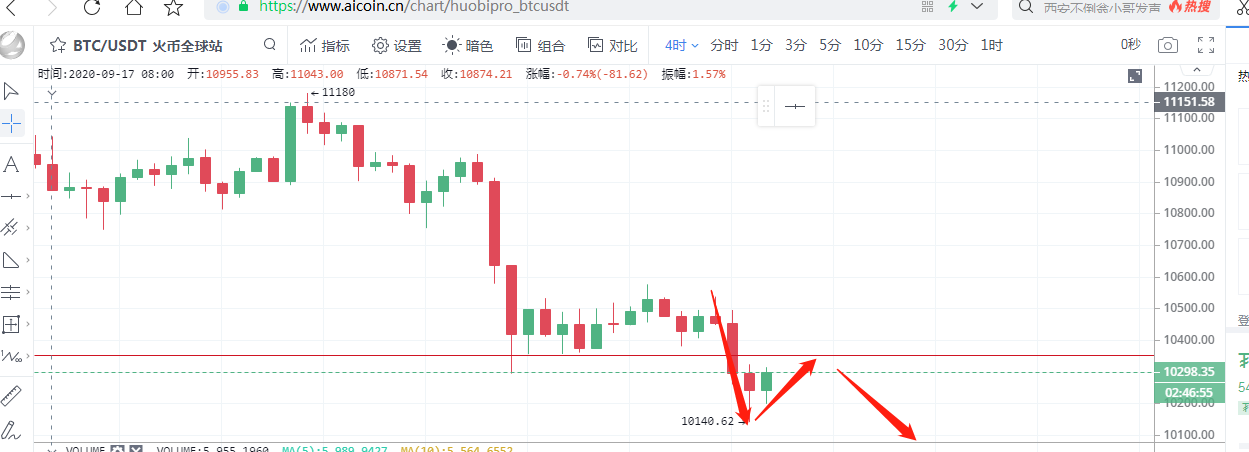 BTC行情分析:今日凌晨比特币大幅跳水至10140一线开始触底反弹,目前运行在10298一线。从日线上看,比特币昨日收取一根大阴线,比特币昨日上方承压布林带中轨承压下行风险,今日空头凌晨一波来袭,打破昨日的震荡区间盘整,行情进一步下行。布林带缩口,币价运行在120日均线一线附近,5日均线扭头向下穿过10日均线形成死叉向下。附图MACD双线粘合在零轴下方运行。红色动能柱弱势加强。日级别线来看,彤欣老师认为后市空头已站优势,行情后将进一步试探10000大关。