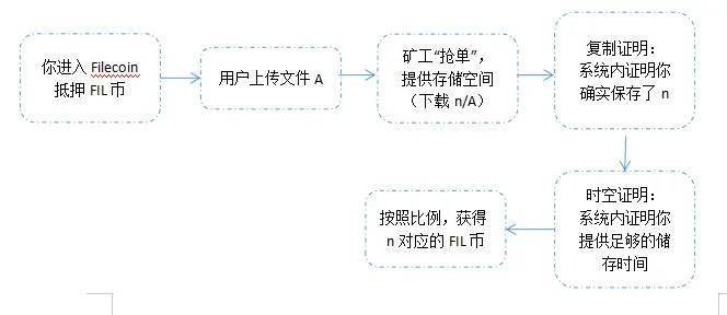 它的存储挖矿过程是:存储矿工抢单,将需要存储的文件下载完毕后,先通过密封保存文件,再向Filecoin提交复制证明和第一次时空证明。提交完毕后,才有资格去“碰运气”——上帝掷飞镖,盲投,自己投票投到自己才能出块。如果本轮没有投中,后续环节也可以通过继续做时空证明来获取出块权。