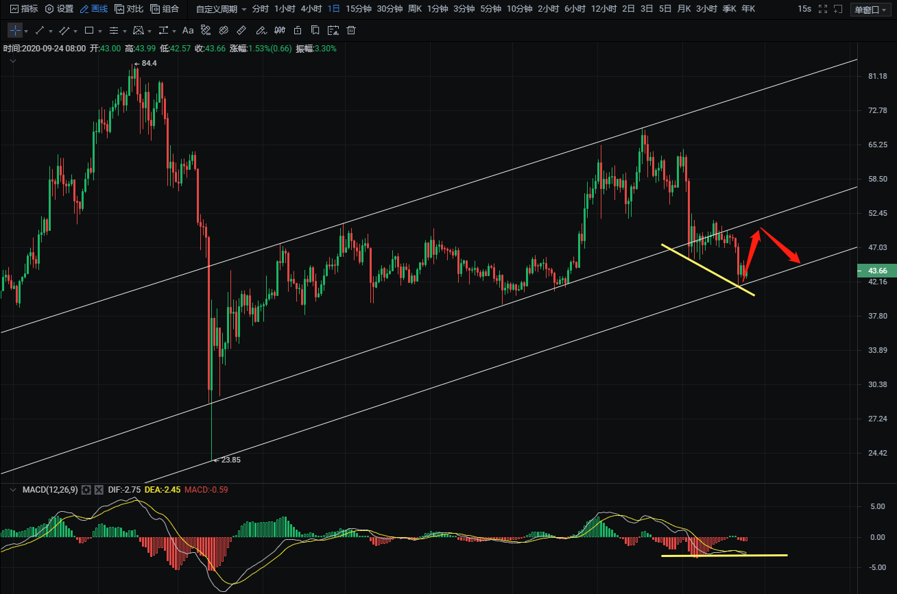 莱特币日线级别来看价格自3.12大跌后大级别保持上行通道运行,5日均线下穿10日均线,多头量能较弱,日线级别底背离,近期关注价格反弹力度,上方压力位45-50,下方支撑位41-40。操作上高空为主。