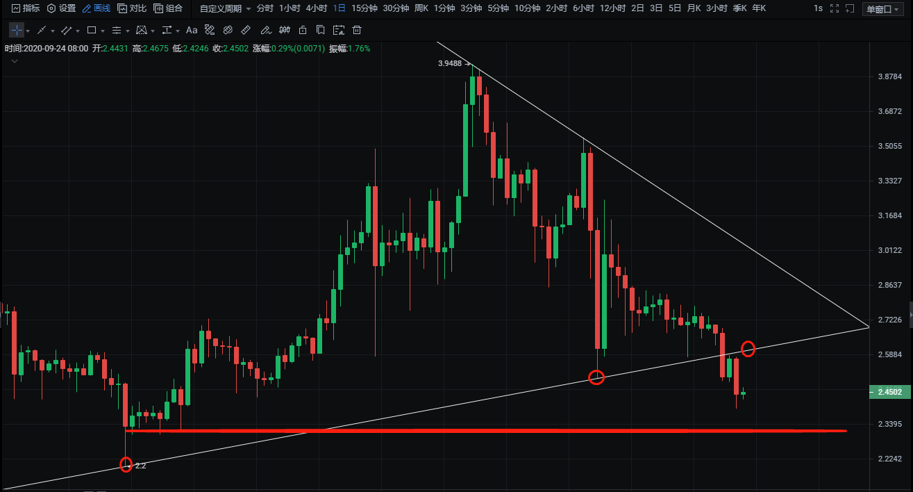 柚子币日线级别来看价格受趋势线压制持续下跌,跌破下方趋势线支撑,各均线呈空头排列,短期不建议介入,都后期反转再考虑,上方压力位2.52,下方支撑位2.32。