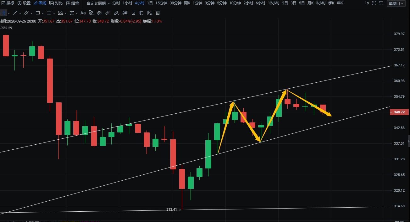 以太坊四小时级别来看价格凌晨冲高至趋势线357附近受阻回落,近期走势多头偏强。价格于布林带上轨下方运行。5日均线上穿10日均线运行,幅图指标MACD于0轴下方金叉运行。KDJ指标三线于超买区域向下拐头,RSI指标三线拐头向下散发。上方压力位357-360,下方支撑位345-340。操作上低多为主,高空为辅。