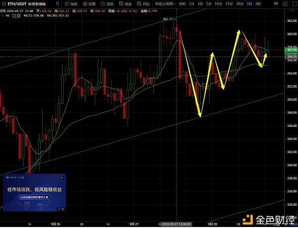 小时图分析,目前K线在358附近震荡。技术上布林带慢慢缩口,K线运行在中轨线下方,形成短期压制。各均线粘连走平托着K线。副图KDJ三线向上开口。MACD快慢线在0轴线上运行,空头量能柱慢慢缩短。4小时ETH行情分析:早间出现短期上行,上行幅度一般,布林带开口打开,布林中轨和各均线上行,说明短期支撑不断上移。副图KDJ三线向上发散,BIAS沿0轴上方运行。MACD快慢线走至0轴上方,绿柱放量。综合看短期整体还是上行趋势。