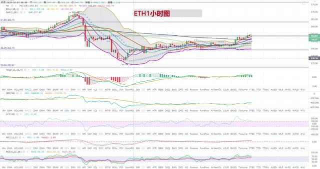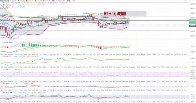最近以太坊行情走的较慢,之前一直处于小区间震荡,直到凌晨以太突破上方压力位之后才走出前期的震荡区间,从4小时线来看,以太大阳线突破布林中轨,币价站上MA30均线上方,前期主力的筹码已经出逃,短期可能会震荡调整在354附近形成新的筹码区间,