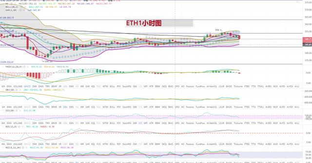今日比特币联动以太坊在2点冲高后,在4小时图里,一直处于区间整理状态,多空方向分歧严重,在下午14点左右,以太坊行情更是跌破了350关口。整体上,以目前的趋势,多头反击不够强力的话,对空头是有利的。