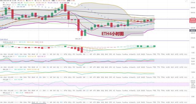 ETH行情分析:从4小时来看,布林带向上偏移逐渐收口,小区间的高点越高,低点越来越低,行情多次触及上轨,随后遇压回落,在MACD中,多头量能还是在持续释放,相对于比特币已经打破区间震荡行情,以太坊走势还是较为缓慢。
